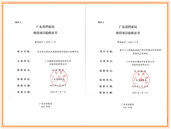 近日,集团总部《多业态大型企业集团档案管控模式创新研究》项目和壹定发地产《基于人工智能的房地产项目档案全生命周期管理及应用研究》项目通过省档案科技项目验收,两个项目获得专家组充分肯定,成为省档案局科技项目管理办法修订后首批通过科技验收的项目。